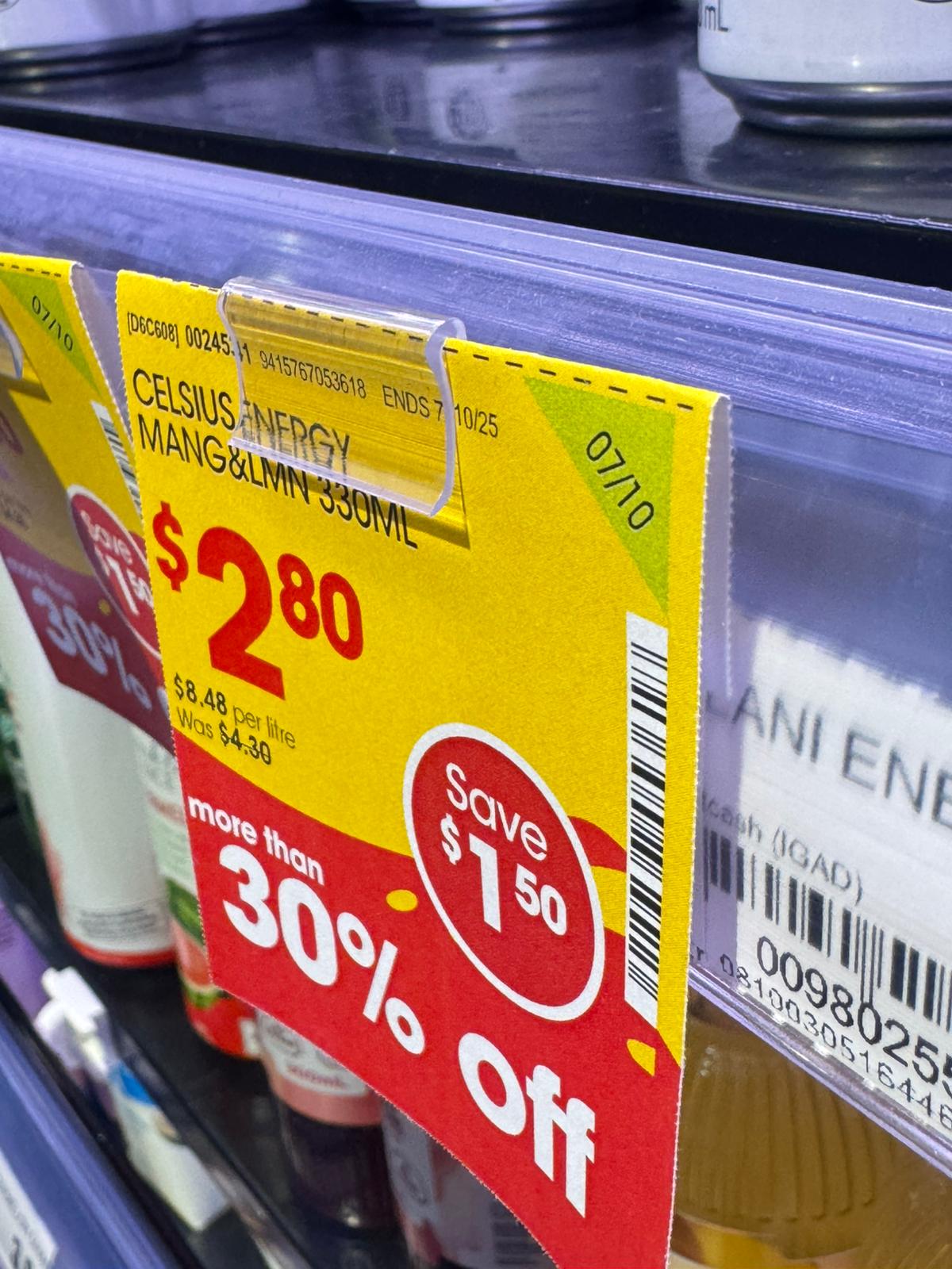 Clear plastic shelf talker clip securely holds promotional signs, price tags, or product information at eye level on gondola shelves.